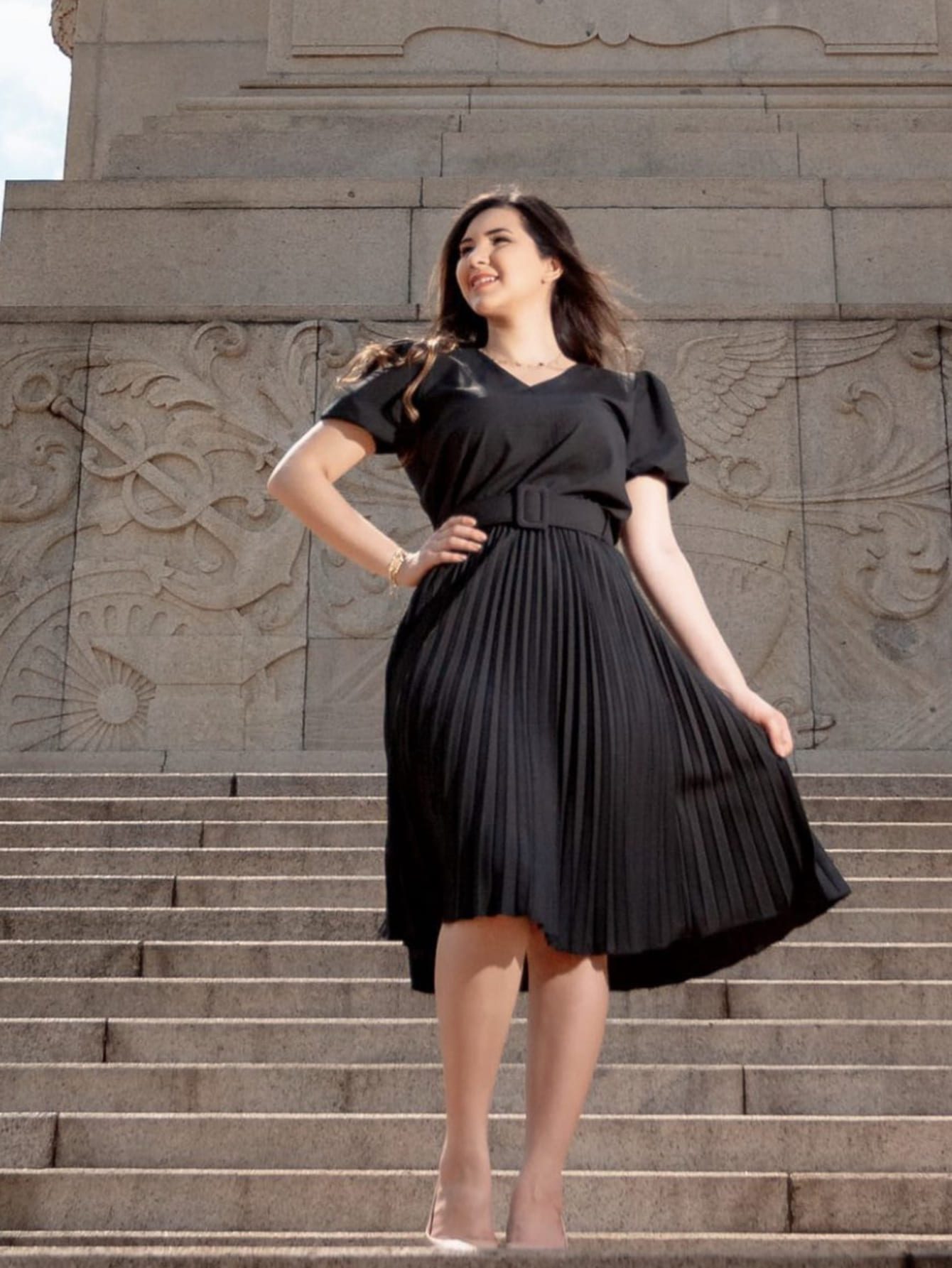 Essa combinação de manga bufante, gola V e cinto cria uma harmonia perfeita, resultando em um visual deslumbrante.