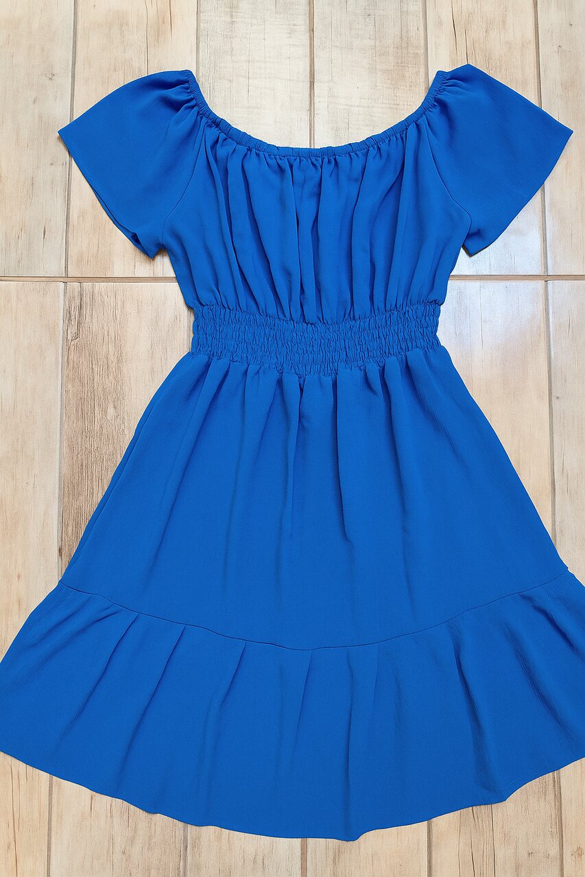 Detalhes: Decote ombro a ombro, mangas esvoaçantes, cintura elástica e saia com babado.